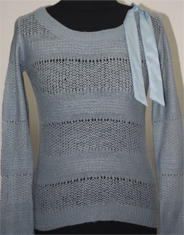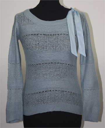 America Today vesta/pulover svijetlo plave boje. Pletivo je tanje, mucasto i rupičasto. Ukrasne satenske vrpce na ramenu (mogu se nositi otpuštene ili zavezati u mašnicu). Rastezljiva.