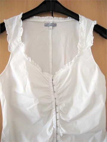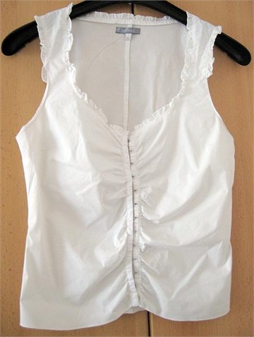 Bez rukava. Strukirana, dekoltirana. Ukrasi od volančića oko dekoltea i na naramenicama. Kopčanje sa malim metalnim drukerima. Jako rastezljiva. Na majčici piše veličina XL.
