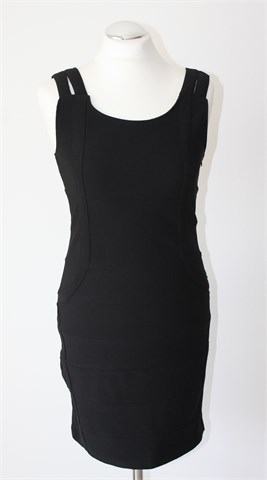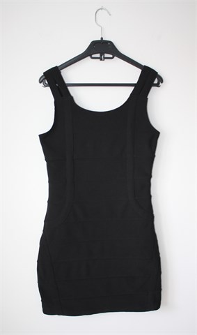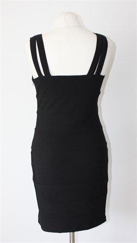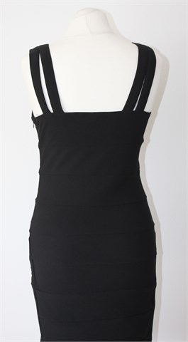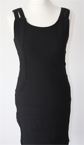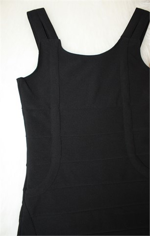 Amisu haljina bez rukava crne boje (model podsjeća na bandage modele haljina). Tanke naramenice, bočni cif. Rastezljiv materijal (detalji vidljivi na slici izbliza - prošivi).