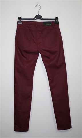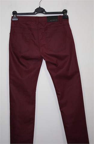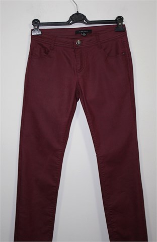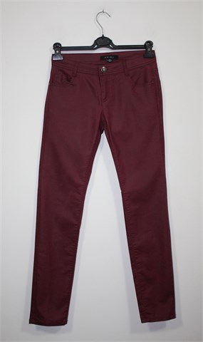 Amisu hlače zagasito bordo boje sa wax efektom. Prednji cif i kopčanje, pasica za remen. Prednji i stražnji klasični džepovi. Rastezljive, materijal je kao tanak traper.