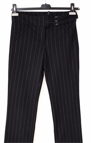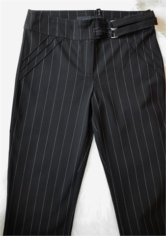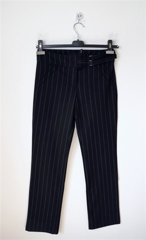 Amisu hlače crne boje sa bijelim prugama. Klasični kroj sa ravnim nogavicama. Prednji cif i kopčanje, ukrasni ušitci na bokovima i ukrasno kopčanje. Blago rastezljive.