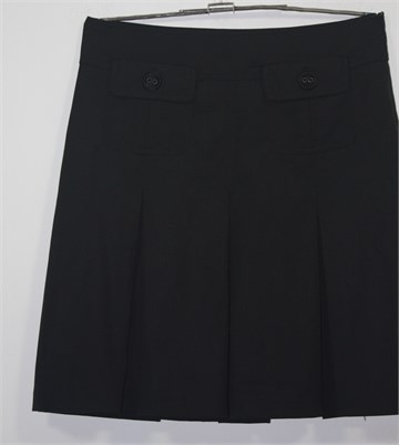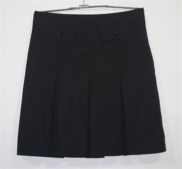 Amisu suknja crne boje sa faldama (sa obje strane). Prednji ukrasni džepovi, bočni cif. Podstavljena.