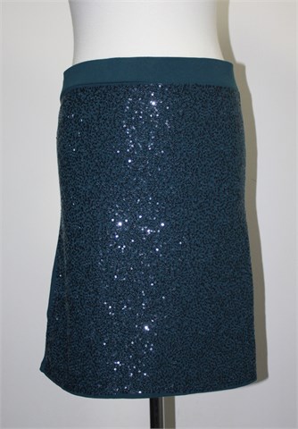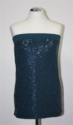 Amisu suknja (ili topić bez naramenica - vjerujem da se može nositi na oba načina) tamnije nijanse petrolej boje, sa prednje strane su našivene šljokice. Guma u gornjem dijelu, mekan i rastezljiv materijal.