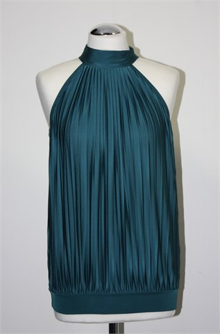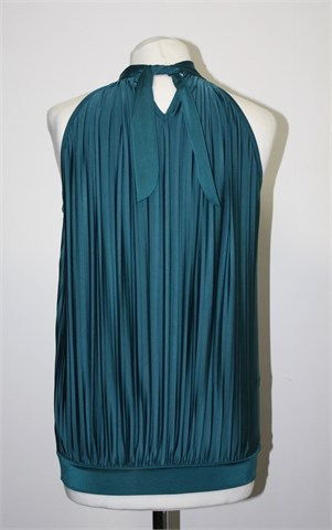 Amisu plisirani topić bez rukava, tamnije petrolej zelene boje (na etiketi oznaka boje dark teal - uživo tamnija i zelenija nijansa). Sa stražnje strane vezanje, stegnut pasicom u bokovima (vidjeti sliku). Lagan i rastezljiv materijal.