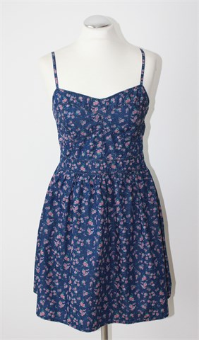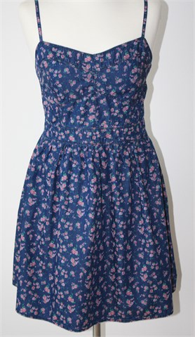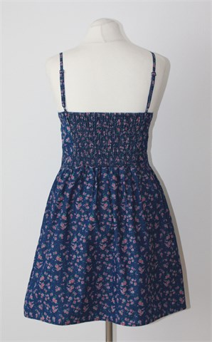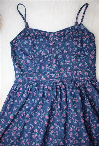 Amisu haljina od tankog trapera, plave boje sa cvjetnim printom (boje i uzorak printa vidljiv na slikama). Tanke podesive naramenice, prošivena gumicama na leđima (prilagodljiva širina - vidjeti mjere).