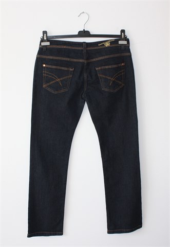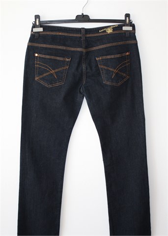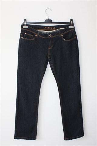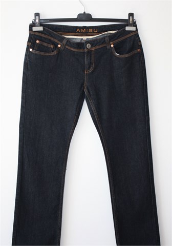 Amisu traper hlače tamno plave boje. Prednji cif i kopčanje, pasica za remen. Prednji i stražnji džepovi, rastezljive. Plitki model (vidjeti mjere).