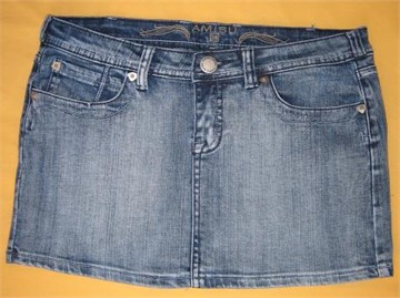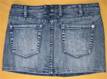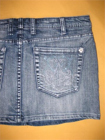 Sastav: 98% pamuk 2% elastin, traper Kratka, sa prednjim cifom i pasicom za remen. Na stražnjim džepovima aplikacija od cirkona. Sadrži elastin, rastezljiva. Na suknji piše broj 38.