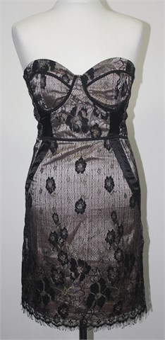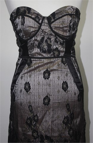 Amy's "korzet" haljina, podstava je zlatno-bež boje a gornji sloj haljine je crna čipka sa cvjetnim uzorkom i detaljima od zlatnog konca. Gornji dio "rezan" u struku, donji dio prati liniju tijela. Košarice za grudi (bez žica). Pretpostavljam da se može nositi i bez naramenica ali ima haklice za klasične naramenice (kao od grudnjaka) koje ne dolaze uz haljinu (mogu se nositi bilo kakve: prozirne, crne ili boje kože).