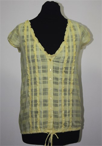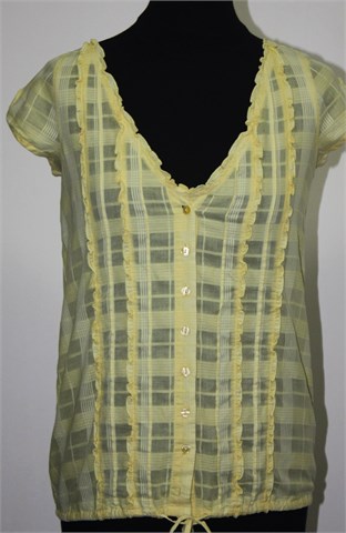 Anchorblue košulja sa kratkim rukavima, žute boje sa prugastim uzorkom. Sa prednje strane kopčanje i ukrasni volančići, u pasici je vezica pa se po želji može nositi stegnuta. Čvrst ali vrlo lagan i prozračan pamuk, blago providan. Nije rastezljiva.