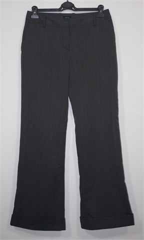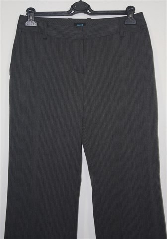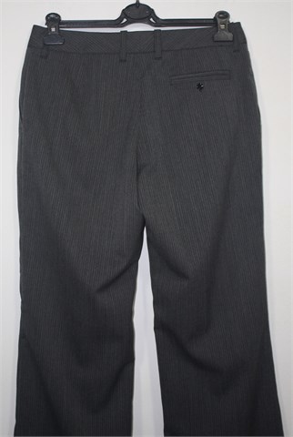 And hlače sive boje sa uskim prugama, nogavice su šire i ravne. Prednji cif i kopčanje, pasica za remen. Prednji bočni, stražnji skriveni džepić sa gumbom. Materijal je kao tanji i lagan štof.