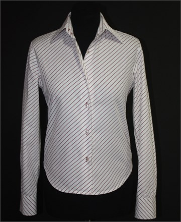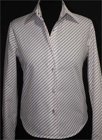 And košulja sa dugim rukavima, bijele boje sa tamno crvenim kosim prugama. Blago strukirana, čvrst i nerastezljiv pamuk.
