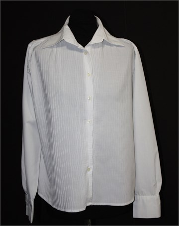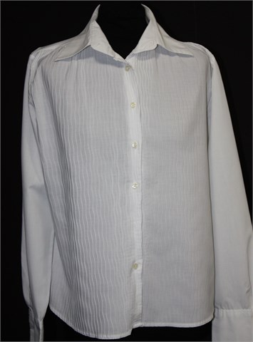 And košulja sa dugim rukavima, bijele boje. Sa prednje strane valoviti uzorak na materijalu, klasično kopčanje (jedan gumbić nedostaje). Stražnji ušitci, blago strukirana.