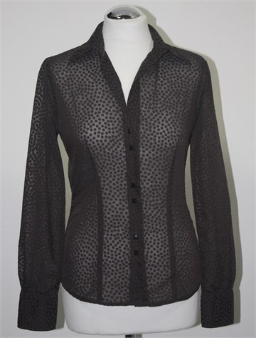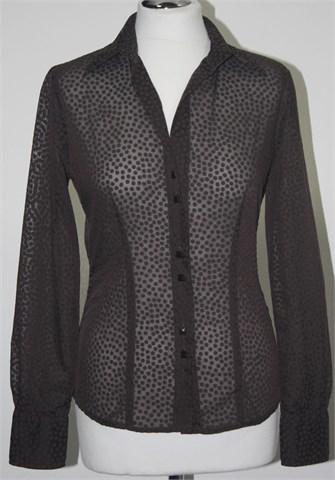 And košulja sa dugim rukavima, smeđe boje sa točkicama. Prednje kopčanje sa ukrasnim gumbima (cvjetići), prednji i stražnji ušitci (strukirana). Lagan i nerastezljiv materijal, prozirna.
