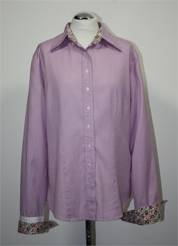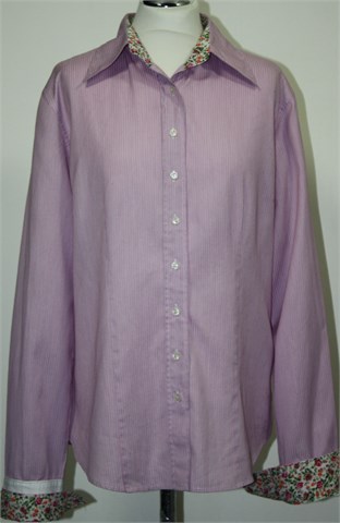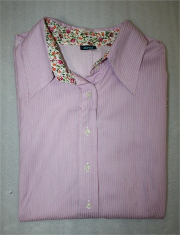 And košulja sa dugim rukavima, prugasta kombinacija roze i bijele boje sa cvjetnim detaljima (unutrašnjost ovratnika i ruba rukava). Prednje kopčanje, blago strukirana. Nije rastezljiva. Rukavići se nose podvinuti da se vidi cvjetni uzorak (kao na slici) ali mogu se nositi i otpušteni (mjereno podvinuto, kao što je slikano).