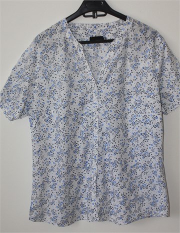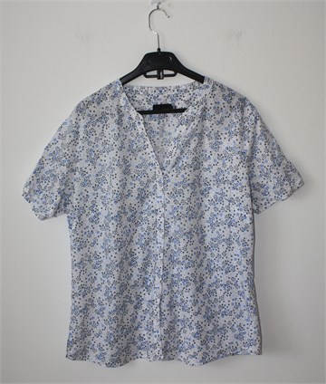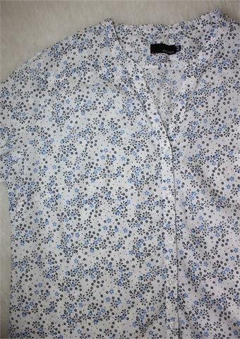 Andrea košulja sa kratkim rukavima, bijele boje sa cvjetnim printom (boje i uzorak printa vidljiv na slikama). Prednje kopčanje, ušitci. Mali bočni prorezi. Nije rastezljiva.