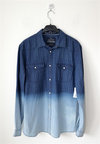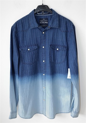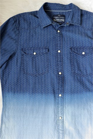 Angelo Litrico (C&A) košulja sa dugim rukavima, plave boje (od tamnije do svjetlije nijanse - vidljivo na slikama) i sitnim uzorkom na materijalu. Prednje kopčanje sa drukerima, džepići na prsima (svi drukeri su ukrasni, sedefasti). Nije rastezljiva. Oznaka modela - slim fit.