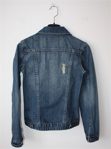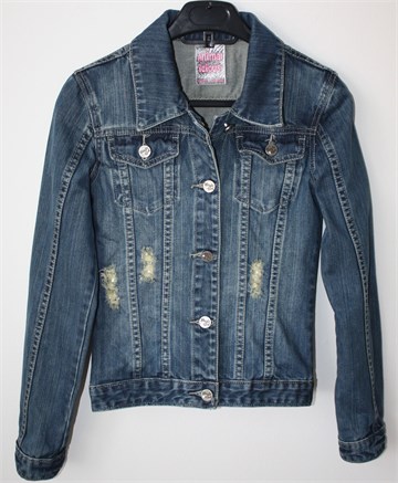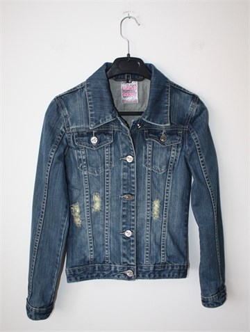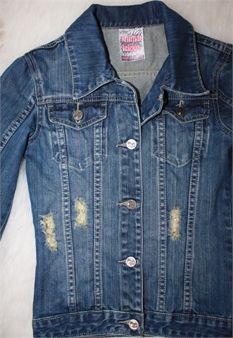 Animalicious traper jakna plave boje/used look. Prednje kopčanje, džepići na prsima. Mjestimično ocufani dijelovi sa ušivenim šljokicama. NIje rastezljiva.