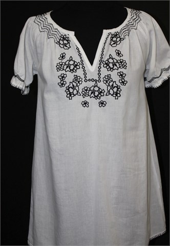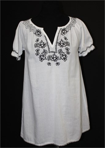 Ann Christine duža bluza sa kratkim rukavima, bijele boje sa crnim izvezenim detaljima. Tanji i lagan pamuk, blago providan.