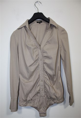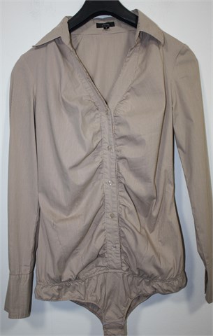 Ann Christine košulja-body sa dugim rukavima, prugasta kombinacija bijele i svijetlo smeđe boje. Prednje kopčanje (uz kopčanje nabori), kopčanje sa drukerima između nogu. Tanja i vrlo rastezljiva.