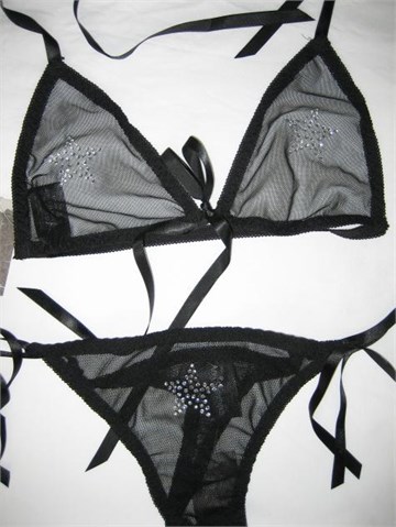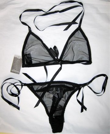 Prekrasan komplet tange + grudnjak od crne sitne rastezljive mreže, ukrasne zvjezdice od cirkona. Tange se vežu bočnim satenskim trakicama. Grudnjak ima elastičnu traku koja ide oko leđa, vezanje oko vrata sa satenskom trakicom.