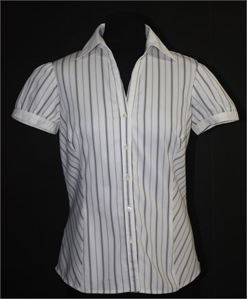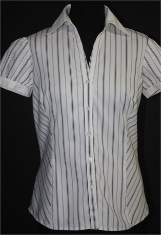 Ann Taylor LOFT košulja sa kratkim rukavima, bijele boje sa crnim prugama. Prednje kopčanje, prednji i stražnji ušitci (strukirana). Mekan i blago rastezljiv materijal, lijepo se formira po tijelu.