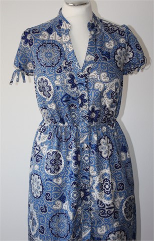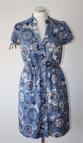 Ann Taylor Loft haljina sa kratkim rukavima, retro uzorak plavo-sive boje sa cvjetnim printom (boje i uzorak printa kao na slikama). Prednje kopčanje, gumica u struku. Na krajevima rukava vezice, podstavljena sivom podstavom. Blago rastezljiva.