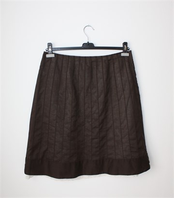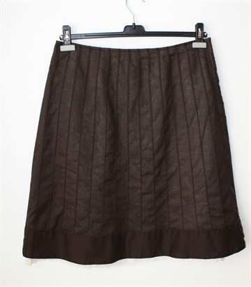 Ann Taylor suknja tamno smeđe boje, za dno podstave našivena je ukrasna čipkasta traka bijele boje. Bočni cif, ukrasni preštepi sa obje strane. Tanja i lagana.