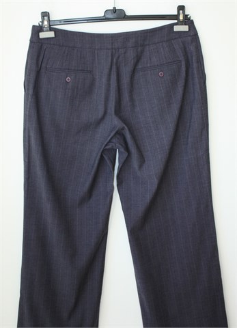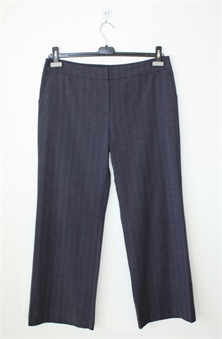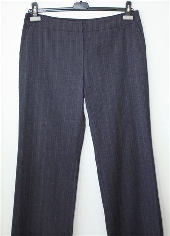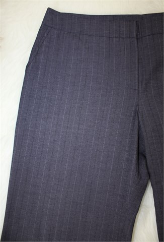 Anne Klein suits hlače sivo-plave boje sa diskretnim prugastim uzorkom (vidljivo na slikama). Prednji cif i kopčanje, bočni kosi džepovi. Stražnji skriveni džepovi sa gumbom. Lagan i vrlo blago rastezljiv materijal.