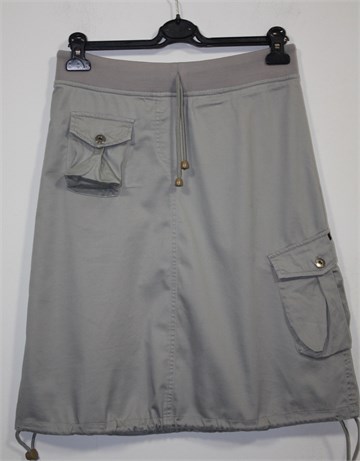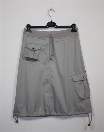 Antika pamučna suknja svijetlo sive boje. U struku gumica i trakica za zatezanje pa je širina dosta prilagodljiva (vidjeti mjere). Džepići sa preklopom i gumbom, tanji i lagan pamuk. U dno suknje je ušivena vezica koja se bočno može stegnuti.