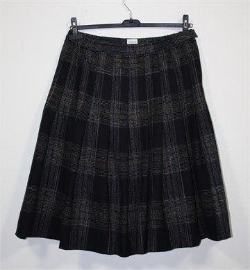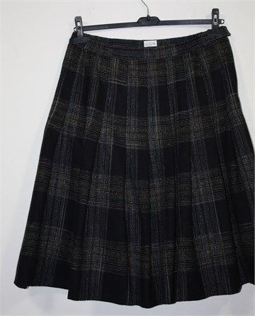 Atelier Creation prekrasna vunena suknja sa faldama, tamno plave (gotovo crne) boje sa prugastim uzorkom. Bočni cif i gumbić, bočne gumice na pasici. Podstavljena. Deblji vuneni štof.