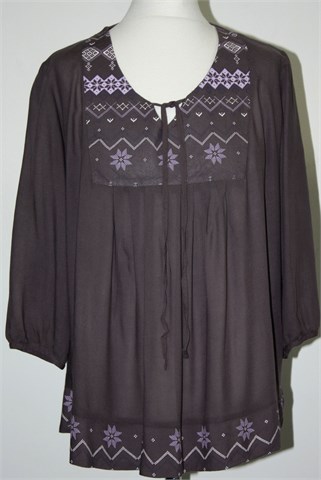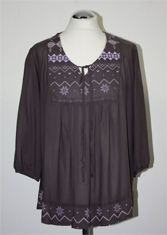Atlas for women bluza sa poludugim rukavima, sive boje. Sa prednje strane i na pasici aplikacije (ljubičasto-bijelo-lila boje - uzorci kao na slikama), prednje vezanje sa trakicama. Tanja i lagana.