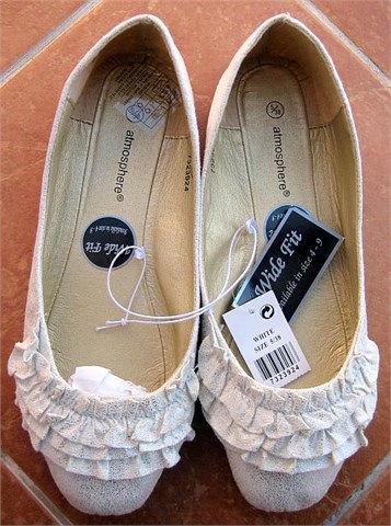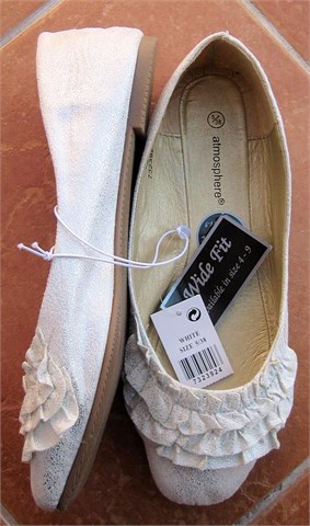Preslatke balerinke bijelo-srebrne boje, sa prednje strane 4 volančića. Gumeni džonovi, zlatna unutrašnjost.