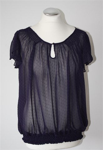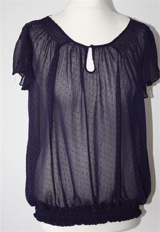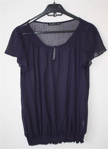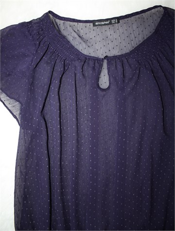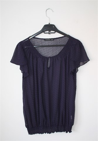 Atmosphere bluza sa kratkim rukavima, tamno ljubičaste boje sa uzorkom točkica (vidljivo na slikama). Blago zgužvan materijal, pasica prošivena sa gumicama. Tanka i lagana, providna. Blago rastezljiva.
