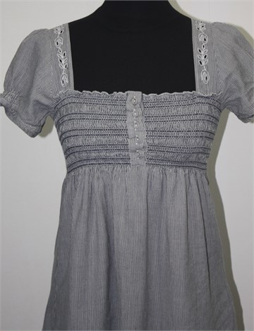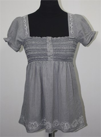Atmosphere prugasta bluza/košulja u kombinaciji bijele i plave boje. Kratki rukavi, stegnuta gumicama u dijelu grudi. Ukrasne aplikacije od konca. Lagan i prozračan pamuk.