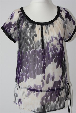 Atmosphere bluza/tunika sa kratkim rukavima i šarenim uzorkom/printom (boje i uzorak kao na slikama). Prednje ukrasno kopčanje, oko ovratnika i ruba rukava saten crne boje. U struku vezica (može se po želji stegnuti), tanak i lagan materijal, providan.