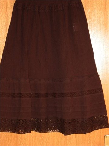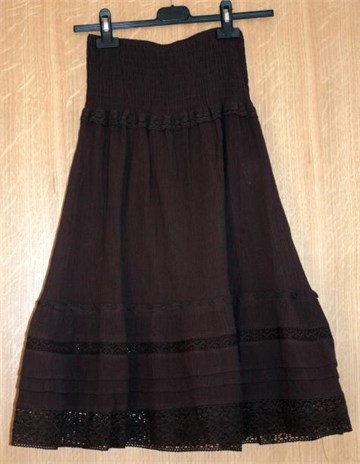 Kratka haljina/tunika tamno smeđe boje, bez naramenica. Gornji dio sa ušivenim rastezljivim gumicama tzv. "žabicama" tako je vrlo prilagodljiva širina. Materijal je blago zgužvan i ne treba se peglati. Detalji od čipke. Može se nositi i kao suknja :)