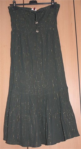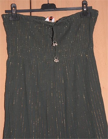 Prekrasna ljetna haljina tamne maslinasto zelene boje, cijelom haljinom ušivene zlatne niti. Bez naramenica, cijeli gornji dio haljine sa ušivenim rastezljivim koncem tako da je prilično prilagodljiva širina. Iznad prsa vezanje na špagice, ukrasne metalne kuglice.