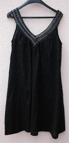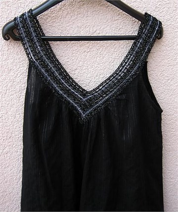 Haljina/tunika crne boje sa ušivenim srebrnim nitima kroz cijelu haljinu. Naramenice i dekolte (sa obje strane) napravljen je od končanih niti srebrne i crne boje. Široki model, može se nositi stegnuta remenom ili kao tunika na tajice.
