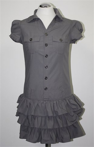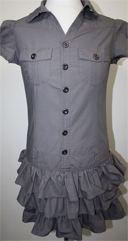 Atmosphere haljina/tunika sa kratkim rukavima, sive boje. Prednje kopčanje sa gumbima, džepići na prsima (sa preklopom i gumbom). Pasica za remen, donji dio tri reda volančića. Čvrst i lagan, nerastezljiv pamuk.