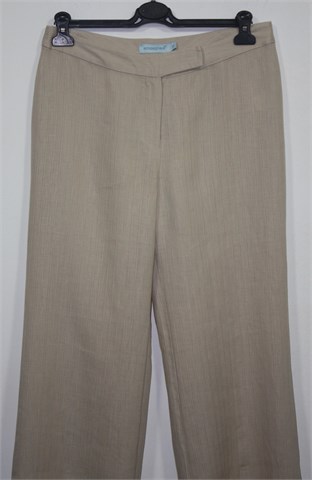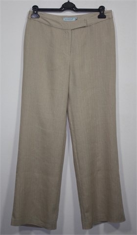 Atmosphere hlače bež boje sa diskretnim prugama u materijalu. Prednji cif i kopčanje, bez džepova. Lagane i prozračne, šire nogavice.