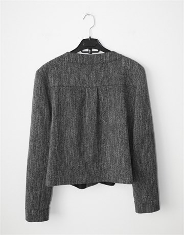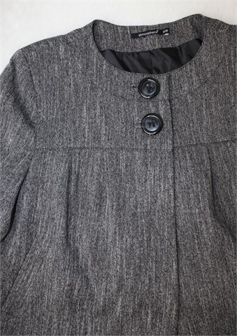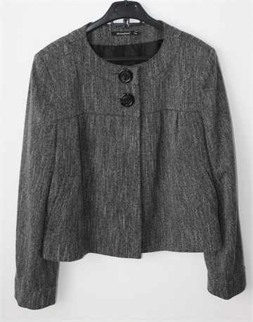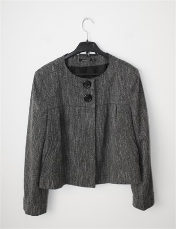 Atmosphere jakna/sako (kratki kaput) prošarano crno-bijele boje (sitan uzorak riblje kosti). Prednje kopčanje sa dva gumba, bočni džepovi (podstava jednog džepa se malo odšila). Jastučići u ramenima, podstavljena. Blago rastezljiva.