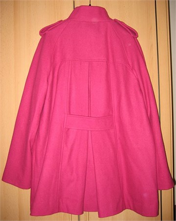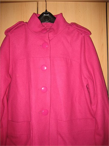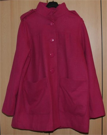 Kupljen proljetos u UK-u, mislim da nije niti nošen (sestri je postao prevelik). Prekrasan kaputić boje ciklame. Mandžete na ramenima, prednja dva džepa i kopčanje na velike gumbe (naravno boje ciklame). Podstava u istoj boji. S obzirom da je dosta širok odgovarao bi i trudnicama (takav je kroj da prikriva obline).