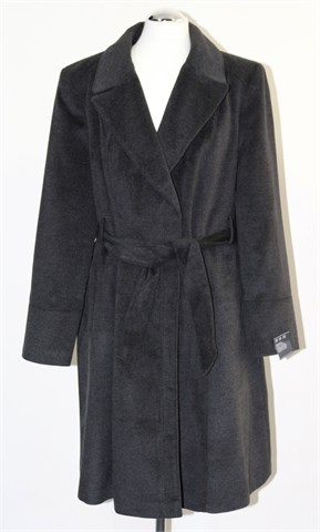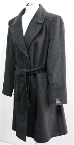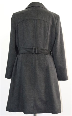 Atmosphere duži kaput tamnije prošarano sive boje. Prednje kopčanje na skrivene gumbe, bočni džepovi. Pasica za remen sa pripadajućim remenom. Blagi jastučići u ramenima, podstavljen. Periv u perilici za rublje.