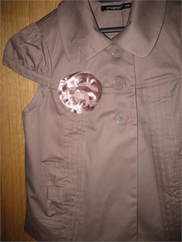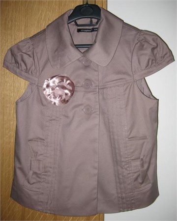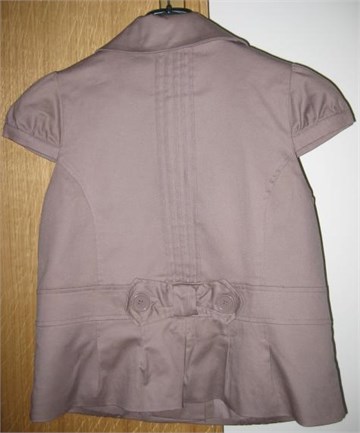 Prekrasan kaputić/jaknica sa kratkim puf rukavičima vrlo neobične boje (najbolje bi je opisala kao prljavo rozo-svijetlo lila boju). Prednji džepovi i kopčanje na tri gumbića. Sa prednje strane ukrasni brošić koji se može skinuti. Malo rastezljiva.