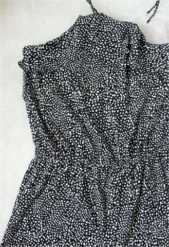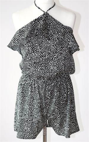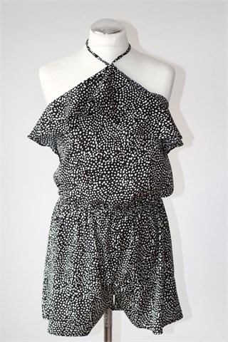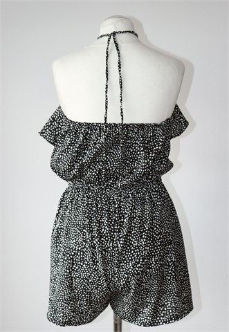 Atmosphere kombinezon crne boje sa bijelim printom/uzorkom (vidljivo na slikama). Bez rukava (vezanje sa vezicama oko vrata, leđa su otvorena), na leđima u gornji šav ušivena je gumica. Donji dio kratke hlače, gumica u struku. Tanak i lagan.