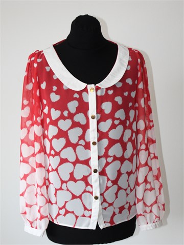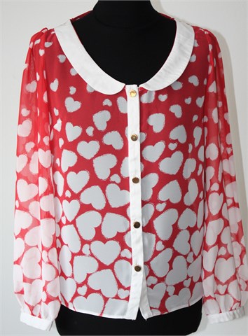 Atmosphere košulja sa dugim rukavima, crvene boje sa bijelim printom srca (vidljivo na slikama, uživo je crvena boja malo zagasitija/tamnija). Prednje kopčanje sa zlaćanim gumbima (malo su pogrebani), bijela kragnica. Tanka i lagana, providna. Nije rastezljiva.