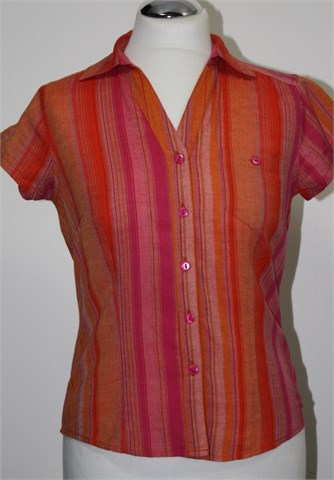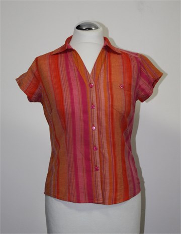 Atmosphere košulja sa kratkim rukavima, prugasta kombinacija većinom roze i narančaste boje (kao na slici). Prednje kopčanje, blago strukirana. Mekan, tanji i vrlo lagan pamuk. Mali džepić na prsima.