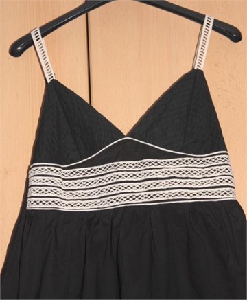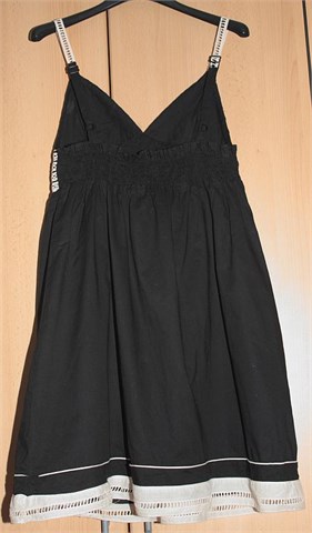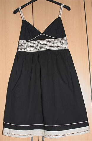 Prekrasna ljetna haljinica, crne boje sa detaljima u bež boji. Rezana ispod grudi, prema dolje se širi. Bretelice su prilagodljive (kao na grudnjaku). Sa stražnje strane su "žabice" tako da je širina u prsima prilično prilagodljiva. Podstavljena. Vrlo lagana i lepršava, idealna za ljeto.