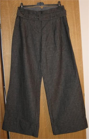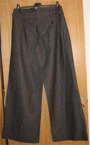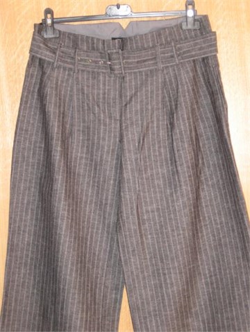 Prekrasne ljetne hlače tamno sive boje sa prugama u svijetlo sivoj boji. Široke nogavice, na dnu zašivene mandžete. Prednji cif i kopčanje, pasica za remen sa pripadajućim remenom od istog materijala kao i hlače. Prednji bočni i jedan stražnji džep. Ušitci sa prednje i stražnje strane. Odlično stoje, vizualno izdužuju figuru :) i idealne su za ljeto.