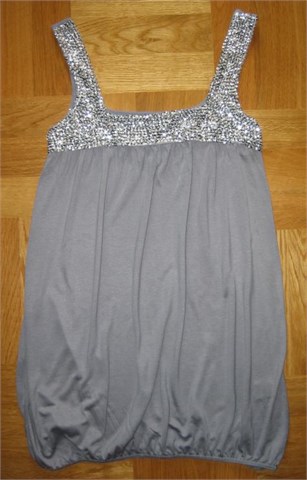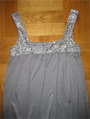 Prekrasna majica/tunika svijetlo sive sa našivenim šljokicama u srebrnoj boji. Balon kroja, na dnu pasice gumica pa je odlična za prikrivanje trbuščića :)